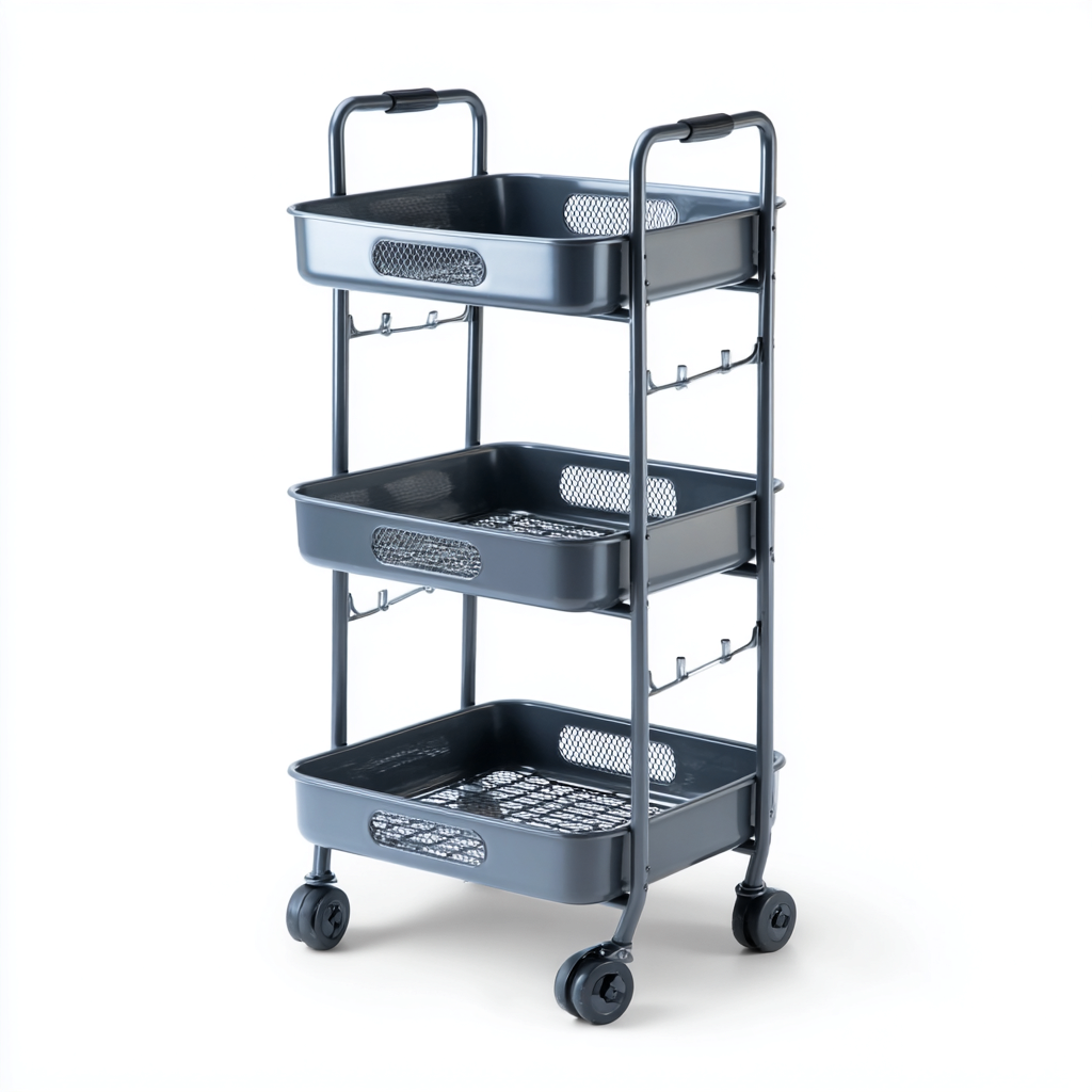 Carrello da cucina su ruote a tre ripiani in metallo con ganci laterali per uso domestico 45x30x85 cm - design moderno