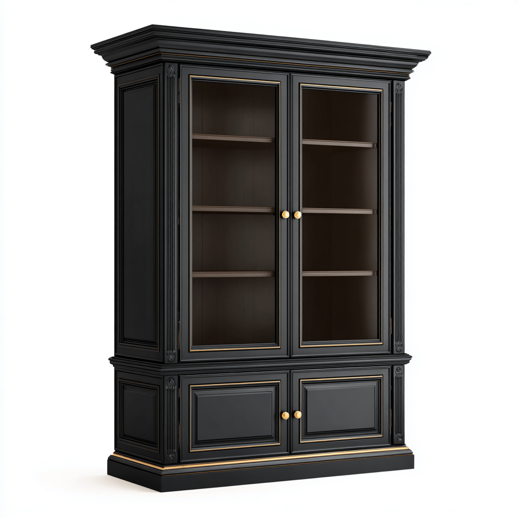 Struttura realizzata in legno con finitura uniforme di colore nero. Le ante superiori con pannelli in vetro permettono di visualizzare il contenuto, mentre le ante inferiori offrono spazio di contenimento chiuso.