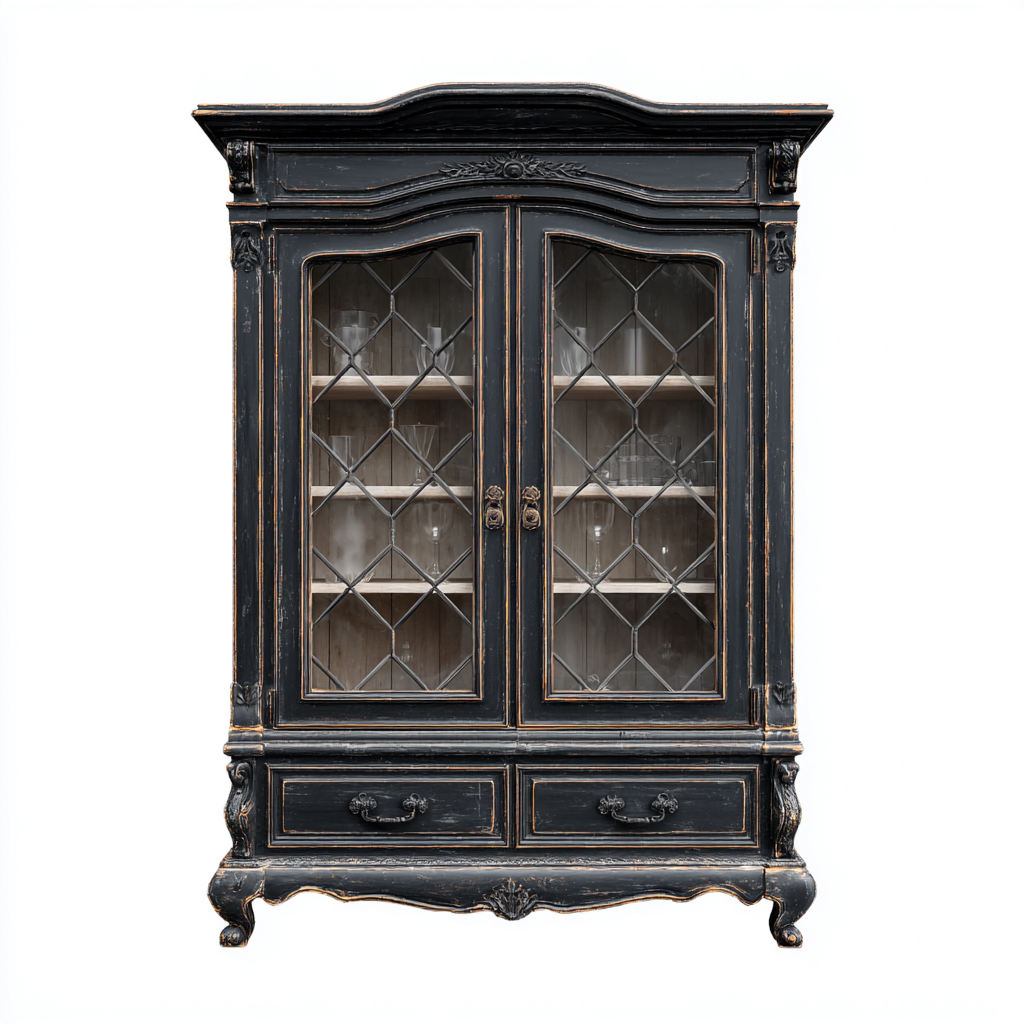 Struttura realizzata in legno con finitura nera effetto anticato. Le ante sono dotate di pannelli in vetro lavorato che consentono la visibilità del contenuto interno mantenendo un aspetto ordinato.