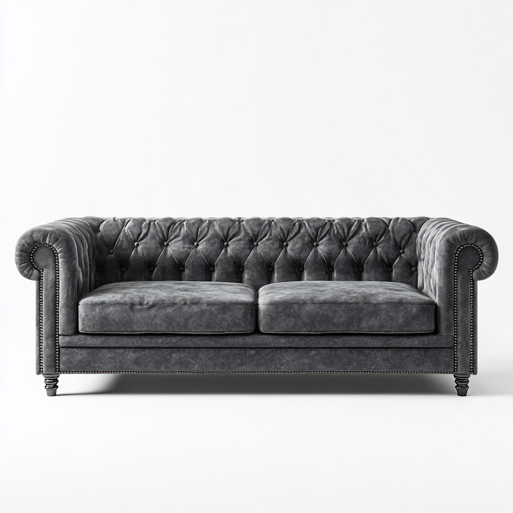 Rivestimento in tessuto di colore grigio con finitura morbida, imbottitura confortevole e struttura robusta. I braccioli arrotondati con borchie decorative e lo schienale trapuntato evidenziano la cura dei dettagli.