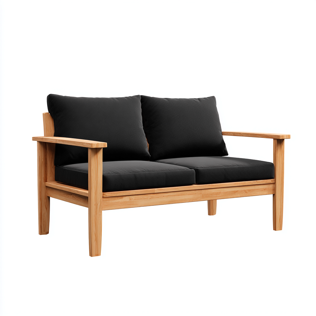 La struttura è realizzata in legno con finitura naturale, adatta all'utilizzo in ambienti esterni. La seduta è completata da cuscini rivestiti in tessuto di colore nero, pensati per un uso regolare all'aperto.