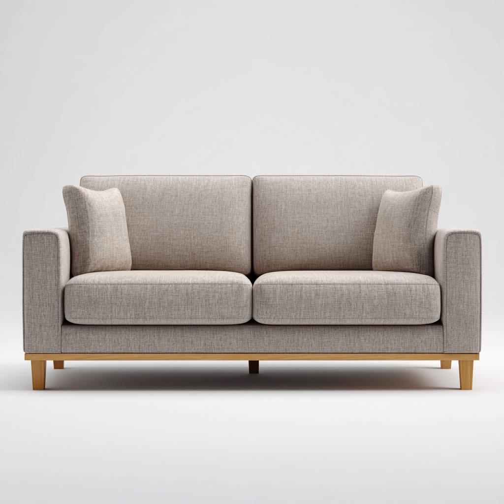 Rivestimento in tessuto di colore beige chiaro, resistente e piacevole al tatto. Imbottitura confortevole su seduta e schienale, con struttura solida e piedini in legno che garantiscono stabilità e durata nel tempo.