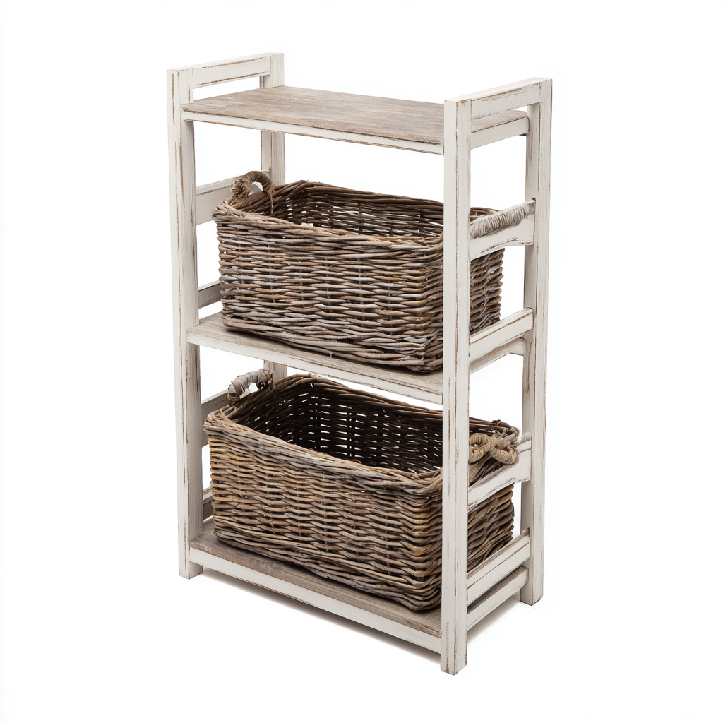 Struttura realizzata in legno con finitura effetto decapato. I cesti sono intrecciati in fibra naturale, lavorati con cura per garantire solidità e praticità.