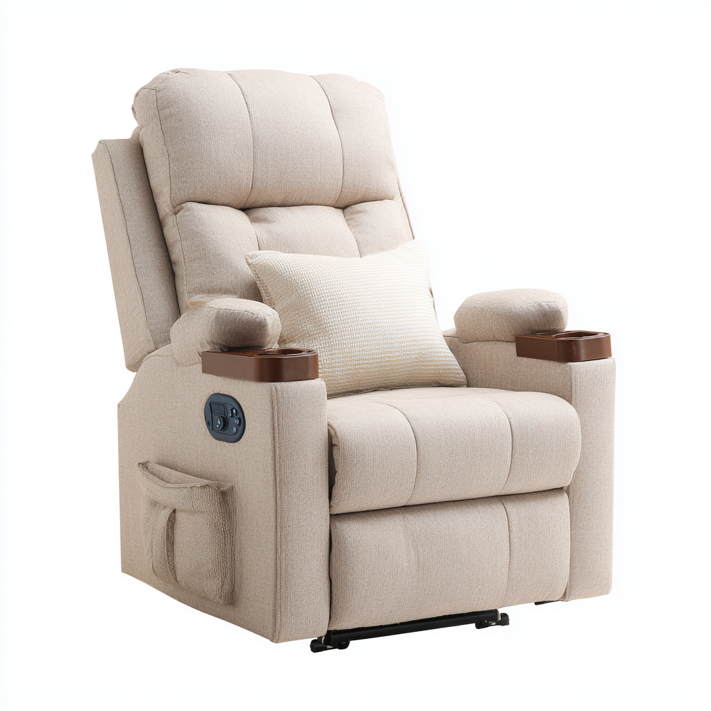 Il rivestimento è realizzato in tessuto imbottito di colore beige, con una texture morbida e piacevole al tatto, ideale per un utilizzo prolungato. La struttura interna è solida e progettata per garantire stabilità e durata nel tempo, integrando un meccanismo reclinabile affidabile.