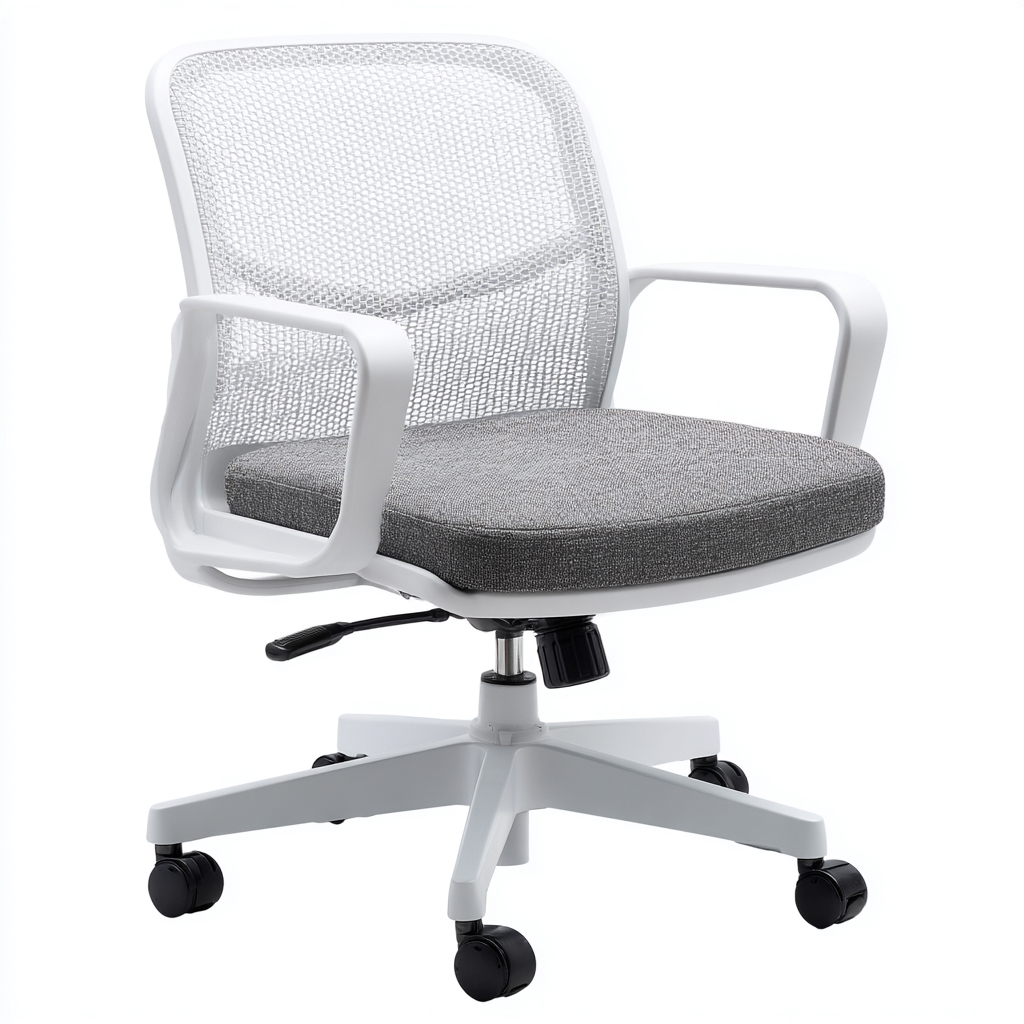 Schienale realizzato in rete tecnica traspirante di colore bianco, seduta rivestita in tessuto grigio. La struttura portante e la base sono in materiale sintetico resistente, progettate per un utilizzo quotidiano stabile.