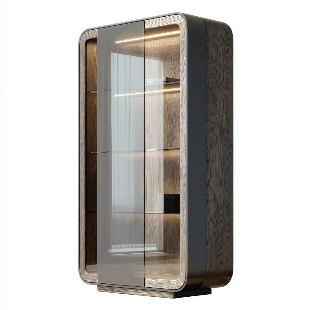 Vetrina progettata per l'esposizione raffinata di oggetti decorativi collezioni o articoli di design. La forma arrotondata e la struttura verticale la rendono adatta a soggiorni sale da pranzo e ambienti contemporanei.